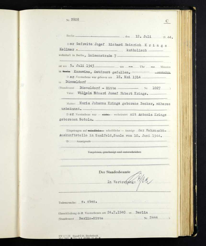 In 1943 my Grandmother’s Father, Heinrich Becker, was killed in an air raid in Wesel. His body probably was never recovered. His death certificate was not issued until 10 years later. The same year, one of my Grandmother’s son, Josef was killed during a battle in July in Korowina, Russia.