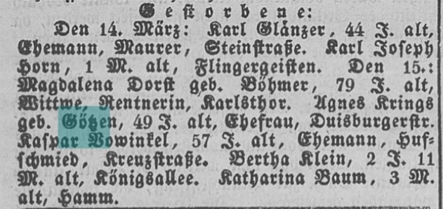 It says: Died: Agnes Krings nee Götzen, 49 years old, wife, Duisburger Street. Andreas died in the year 1871.