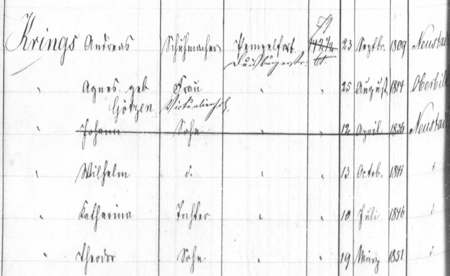 It shows their last and first names, professions, where they lived in Düsseldorf, their exact birth dates and where they were born. Three children are alive at this time. From Andrea’s obituary I know that he had only two surviving sons and grandchildren. The daughter Katharine must have died before 1871. Agnes was only 49 years old when she died.