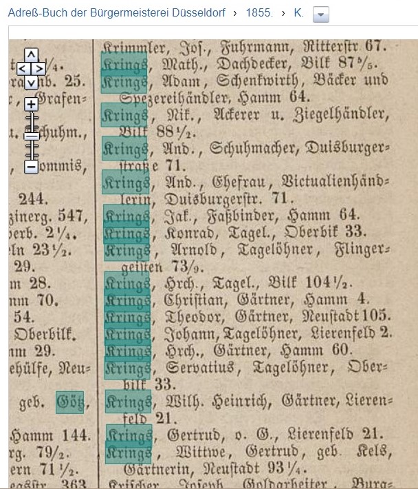 It reads: Krings, Andreas, Shoemaker, Duisburger Street 71 and she is underneath and it reads: Krings Andreas, wife, grocery store dealer. I would think that this was a big deal back in 1855. Both husband and wife were working and had possibly their own businesses. A census, which I have a copy of, was taken in Düsseldorf between 1854-1860. Once more it shows the jobs they have in those years.